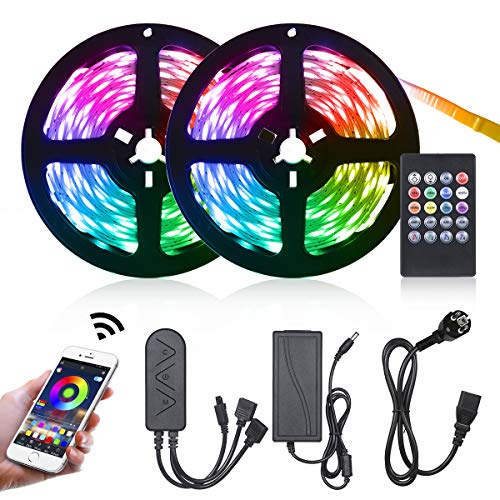 ✅【Tira LED de 10M con Control Remoto】: 2 rollos de tira de luz de LED de 5m con 150 leds cada uno, total 10m con 300 leds, superbrillante pero funcionando a baja temperatura y bajo consumo.Puedes encender / apagar, ajustar el color de la luz y el brillo , ajuste el modo de iluminación a través del control remoto por infrarrojos, el control manual del botón y el control de la aplicación del teléfono inteligente.