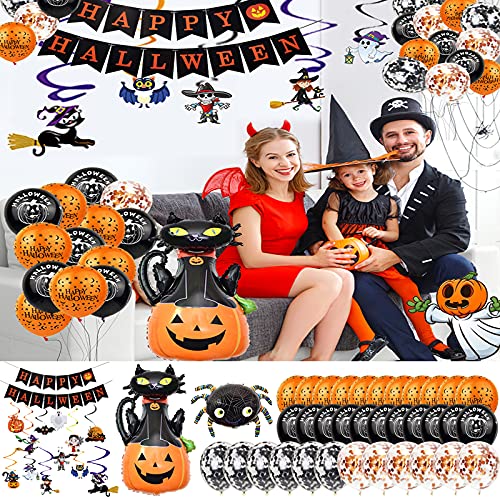 49 Piezas Halloween Decoracion Globos,DUTISON Halloween Decoracion Casa Banner de Feliz Halloween / 34 Globos / 12 Colgante de Espiral / Globo de Calabaza de Gato Negro / Globo de Araña