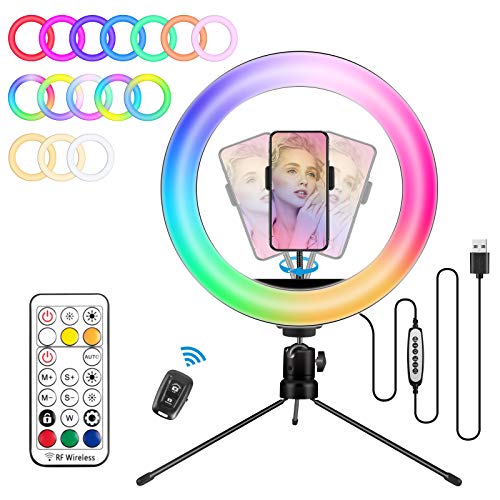 ANVAVA Anillo de Luz con Trípode 10″ Aro de Luz LED 10 Brillos Luz de Anillo RGB con Control Remoto Bluetooth para Movil Selfie Maquillaje Fotografía Youtube TIK Tok…