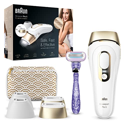 Braun Silk-expert Pro 5 Depiladora Mujer Luz Pulsada IPL con 2 Cabezales Standar y 2 de Precisión, Alternativa a la Depilación Láser en Casa, Regalos Originales para Mujer, PL 5137MN, Blanco/Dorado