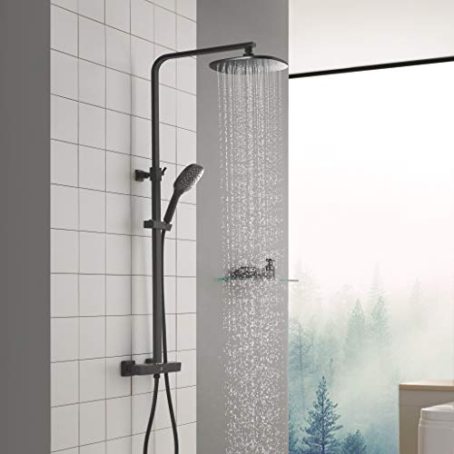 CECIPA Columna Ducha Termostática, Negro Set de Ducha con 9.5″ Ducha de Lluvia + Ducha de Mano, Barra de Ducha 85-120cm Ajustable