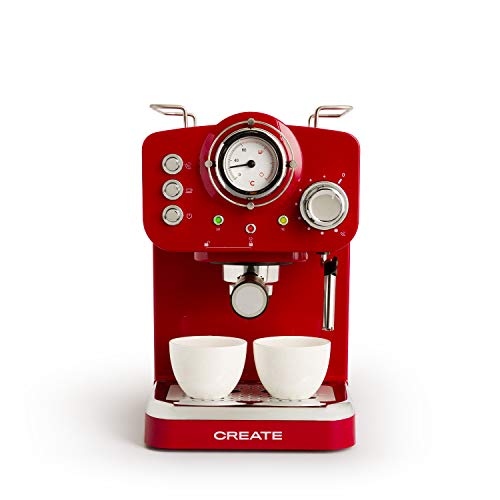 CREATE THERA Retro – Cafetera Express para Espresso y Cappucino, 1100W, 15 Bares, Vaporizador Orientable, capacidad 1.25l, Café Molido y Monodosis, Con Doble Salida (Rojo)