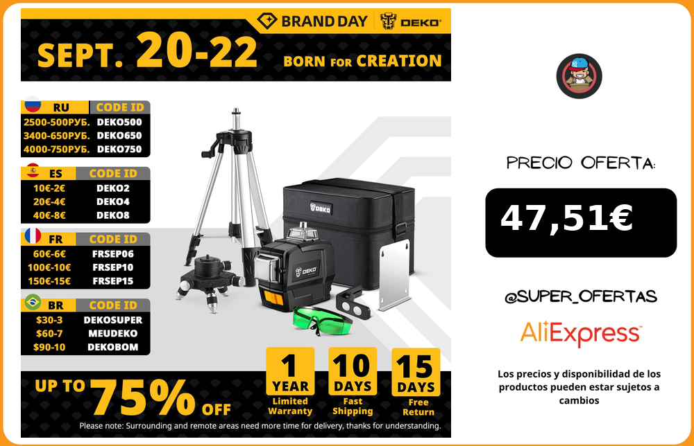 DEKO Nivel láser giratorio verde 3D de la serie DC de 12 líneas, líneas transversales horizontales y verticales con autonivelación, para interiores y exteriores,Consigue increíbles descuentos en artículos de vendedores chinos y de todo el mundo. ¡Disfruta de envíos gratis, ofertas por tiempo limitado, devoluciones sencillas y protección al comprador!