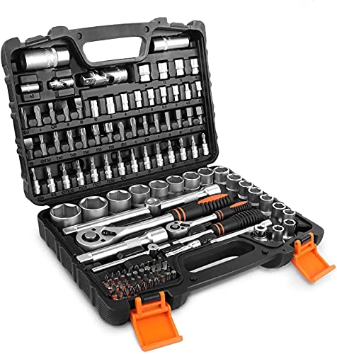 Juego de Llaves de Vaso Profesionales, 119 Piezas, Llave de Carraca Reversible de 1/2″y 1/4″, Manija Giratoria, Barra de Extensión, Kit de Herramientas Mecánicas para el Auto