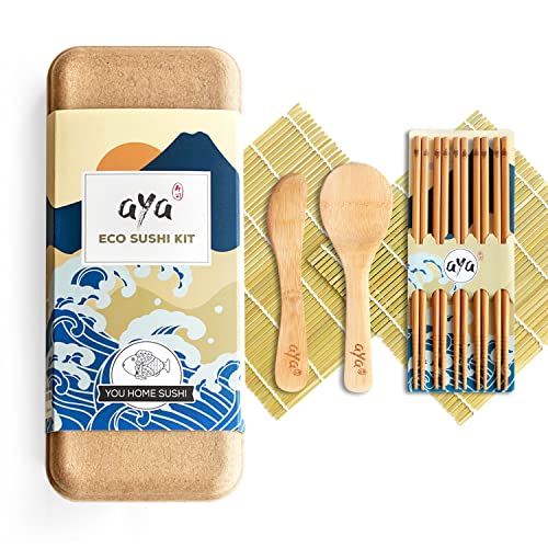 Kit para Hacer Sushi, Original AYA Eco Sushi Kit – Todo Natural Ecológico – Bambú Biodegradable – 2 Esterillas de Sushi – 5 Pares de Palillos – 1 Espátula – 1 Cuchara
