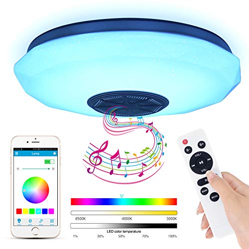 ✅【Multifunción perfecta】: a través de la tecnología Bluetooth y el control remoto, el brillo se puede ajustar y el color se puede cambiar, brindando una hermosa atmósfera a su espacio vital. Puede configurar la hora en la APLICACIÓN y usarla como reloj despertador para encender y apagar las luces de techo LED para la sala de estar. Las luces que cambian de color se pueden usar como altavoz, que puede reproducir música e historias para sus bebés.