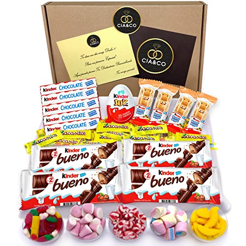 Lote envuelto para Regalo con +25 Chocolates Kinder y 450 grs de Chuches sin Gluten. Con Tarjeta Dedicada Personalizada y Kinder Chocolate, Kinder Bueno, Huevo Joy, Happy Hippos, Lacasitos y Golosinas
