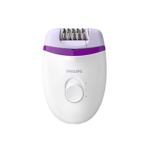 Philips BRE225/00 – Philips Depiladora Satinelle Essential BRE225/00 – Depiladora mujer para piernas con cable compacta, 2 ajustes de velocidad, blanco/morado