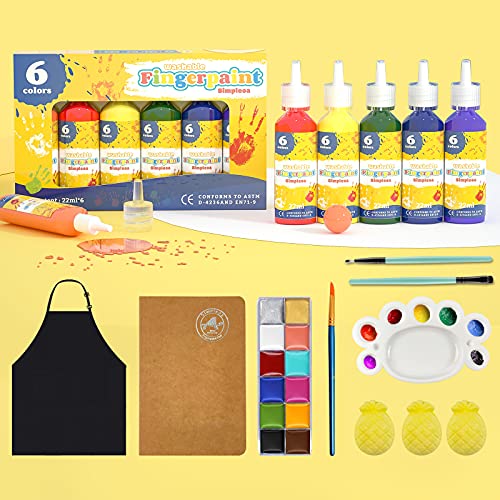 ✅❤️【What does our products contain?】 have 6 paints, in 6 colours, these are red, yellow, orange, green, blue and purple. These come in little squeeze bottles. You have a pack of 2 different sized paintbrushes. You get 12 face paints along with two other brushes to use these with and you also get a finger paint pad too, a apron and three cute little pineapple bath bombs.