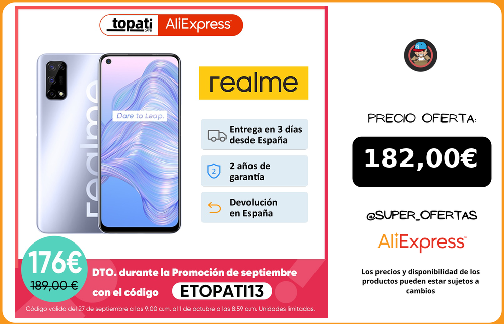 Realme teléfono inteligente 7 5G versión Global, 6GB, 128GB, 6,5 «, 120Hz, pantalla Ultra suave, dimensiones 800U, cámaras Quad de 48MP, carga de Dart de 30W;150€ 15€ Código:09ESOW15,Consigue increíbles descuentos en artículos de vendedores chinos y de todo el mundo. ¡Disfruta de envíos gratis, ofertas por tiempo limitado, devoluciones sencillas y protección al comprador!