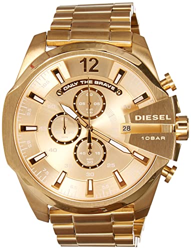 ✅Reloj DIESEL de hombre – Caja redonda de acero inoxidable (diám. 59 mm) con acabado pulido brillante y mate en color dorado – 10 ATM de resistencia a la presión del agua