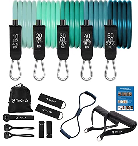 TACKLY Gomas elásticas musculación hasta 150 LB / 68kg con Accesorios Ejercicio Fitness – Kit Gym en casa con 5 Niveles Bandas elasticas de Resistencia – Cintas / Cuerdas elásticas Deporte hogar