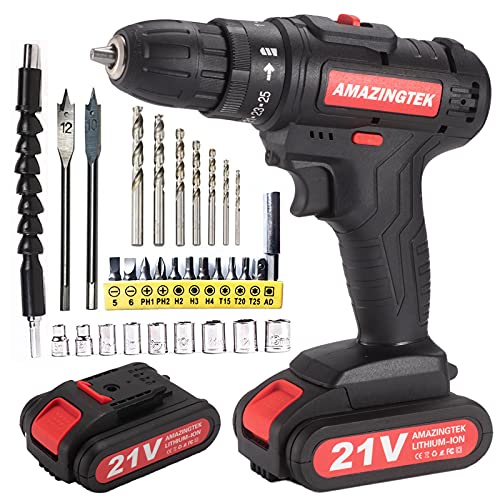 Taladro Atornillador 21V con 2 Baterías, AMAZINGTEK Destornillador Eléctrico (2 Baterías de Litio 1500mAh, 35N.m Par Máx, 2 Velocidades, Selección de 25 + 1, 10mm Portabroca y 34pcs Kits Accesorios)