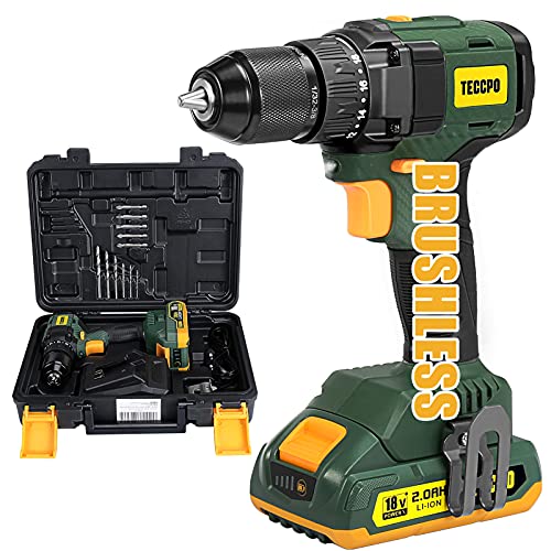 Taladro Atornillador Brushless, TECCPO Taladro Batería 18V, 45NM, 18+1 Ajustes de Par, 1×2.0Ah Batería de Litio, 50Mins Cargador Rápido, Cabezal de Destornillador, BHD350D
